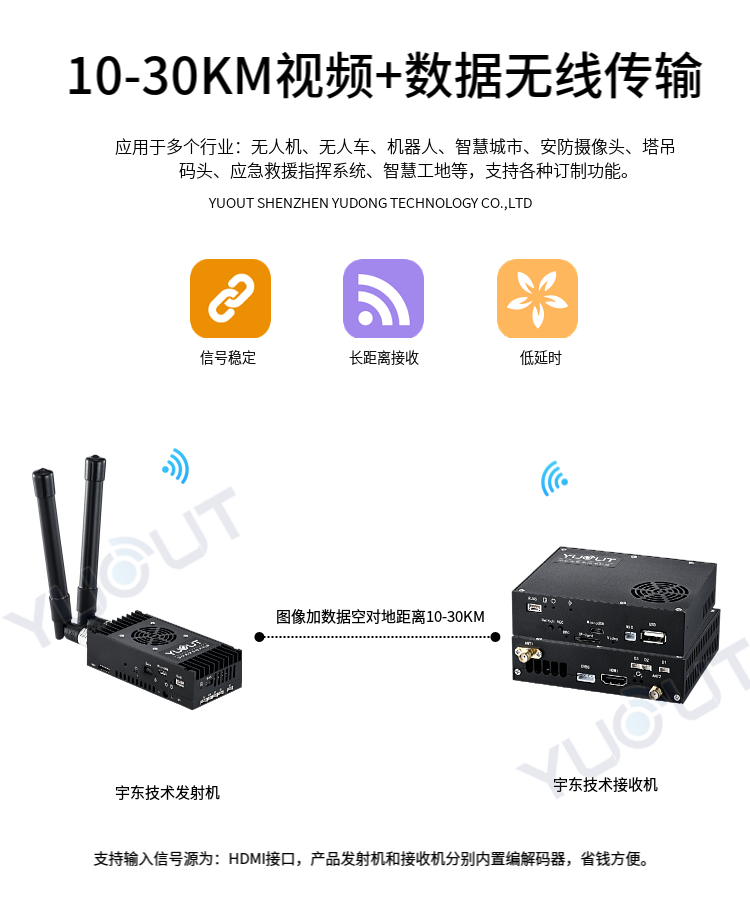 YD-HDT530-DM是應用于無人機行業(yè)的圖數(shù)控一體化超遠距離無線傳輸設(shè)備(最遠可達 15至30 公里),具有體積小、功耗低、通信距離遠等特點,支持高清視頻、飛控數(shù)據(jù)、云臺控制數(shù)據(jù)、遙控器控制數(shù)據(jù)等同時傳輸。